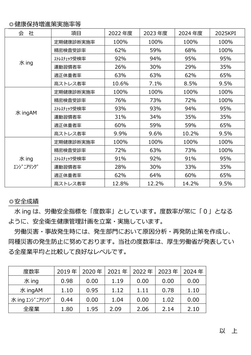 水ing グループ企業理念と行動基準、安全衛生健康管理方針に基づき、「安全・衛生・健康が何ものにも勝る」を基本理念として、各社員の健康はもとより、組織全体が健康であることを目指し、社員と組織全体が能力を十分に発揮できる心身共にいきいきと働ける職場環境や風土づくりを推進します。