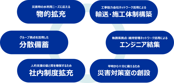 「水支援オペレーション体制」は、災害時の水利用ニーズに応える装備の拡充に加え、物資の備蓄・配備の分散、輸送・設置・施工を担う協力体制の整備、全国のフィールドエンジニアが即応的に集結して支援を担う仕組み、そして支援を統括する災害対策室の常設、社内制度・研修の拡充など、水を届けるための一体的な体制を構築しています。今回出動した給水車は、このうち「物的拡充」の一環として災害時に備えて配備してきた装備の一つであり、災害に限らず渇水という水確保の課題に対しても、必要な場所へ必要なタイミングで水を届ける支援として機能しました。