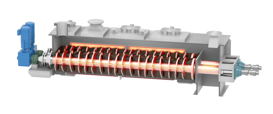 脱水汚泥を攪拌・移送するパドル部分に蒸気を通して加熱できる装置。蒸気で直接加熱するのではなく、伝熱面を介して間接的に汚泥を加熱することで、汚泥に含まれる水分を効率よく蒸発させて乾燥汚泥として排出する。